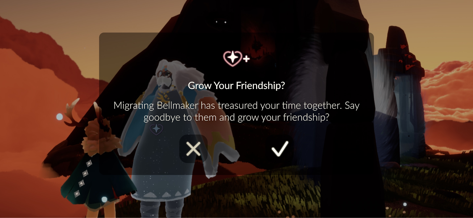 To say goodbye and grow your friendship, click on the friendship icon in the spirit’s menu and you will be asked if you would like to confirm this action. Once confirmed, the friendship meter will fill, and the spirit will depart.