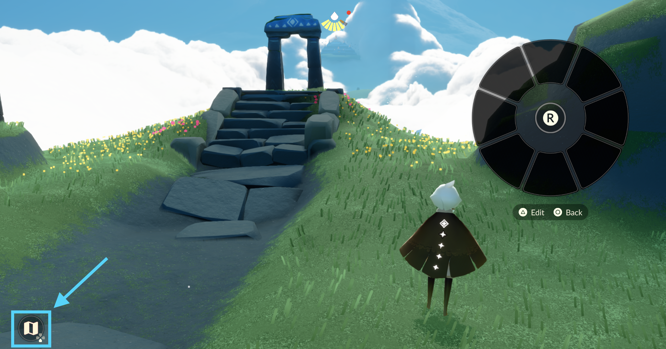Kể từ bản cập nhật 32.0 ngày 6 tháng 1 năm 2026, việc ghé thăm Bệ Đá Bản Đồ không còn là điều kiện bắt buộc để truy cập Bản đồ Sky. Để sử dụng tính năng Bản đồ mọi nơi, hãy nhấn vào nút bản đồ nằm ở góc trên bên phải màn hình.