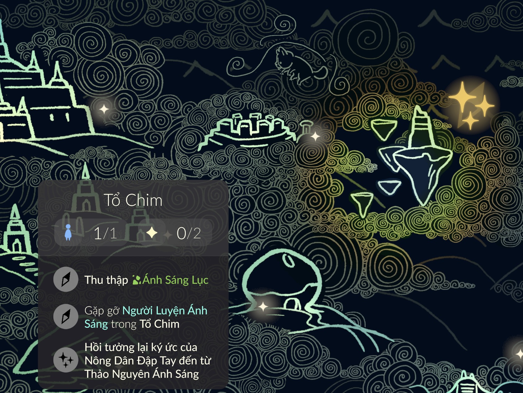 Để xem thêm chi tiết về một khu vực—như tên gọi, số lượng Tinh Linh hoặc Ánh Sáng Chắp Cánh đã tìm thấy, hoặc các Nhiệm Vụ Ngày hiện có—bạn chỉ cần nhấn vào khu vực đó trên bản đồ. Một bảng thông tin chứa các chi tiết này sẽ xuất hiện ở góc dưới bên trái.